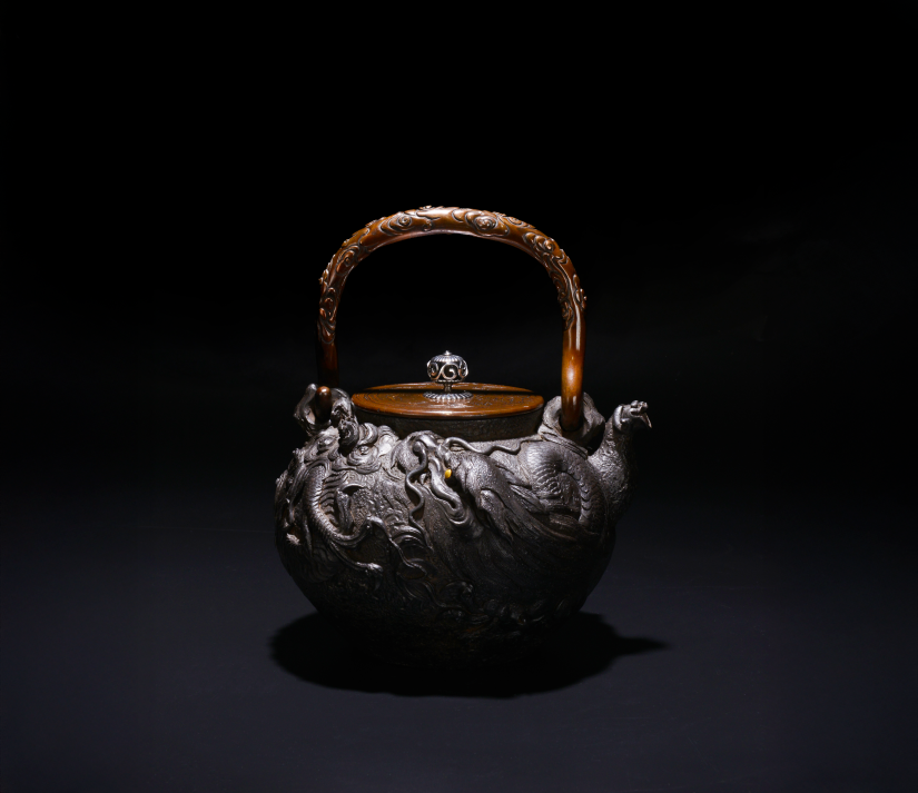 龜文堂造,明治時期波多野正平作湖嚴堂訂製款,獸口壺嘴,嵌金雲龍,盛圖鏤空,雕花銀摘,鏨花鳳凰銅蓋,鏨花雲紋銅把鐵壺。波多野正平,生於江戶1813年,卒於明治1892年。初代波多野正平是脫蠟法的創始人,取自中國青銅器蠟鑄手法,早年與日本文壇巨匠賴山陽等名家合作,初代波多野本人亦是文壇才子,專門爲文人制作雅器茶具,他的鐵壺作品中,只有與賴山陽等文人創合之作才落龜文之印此顆印章;每把龜文之印作品皆帶有濃厚文人風,爲初代波多野正平巔峯時期作品,龜文之印系列作品全世界目前所知不超過七把,其中獸口爲題材的更是唯獨兩把而已。
